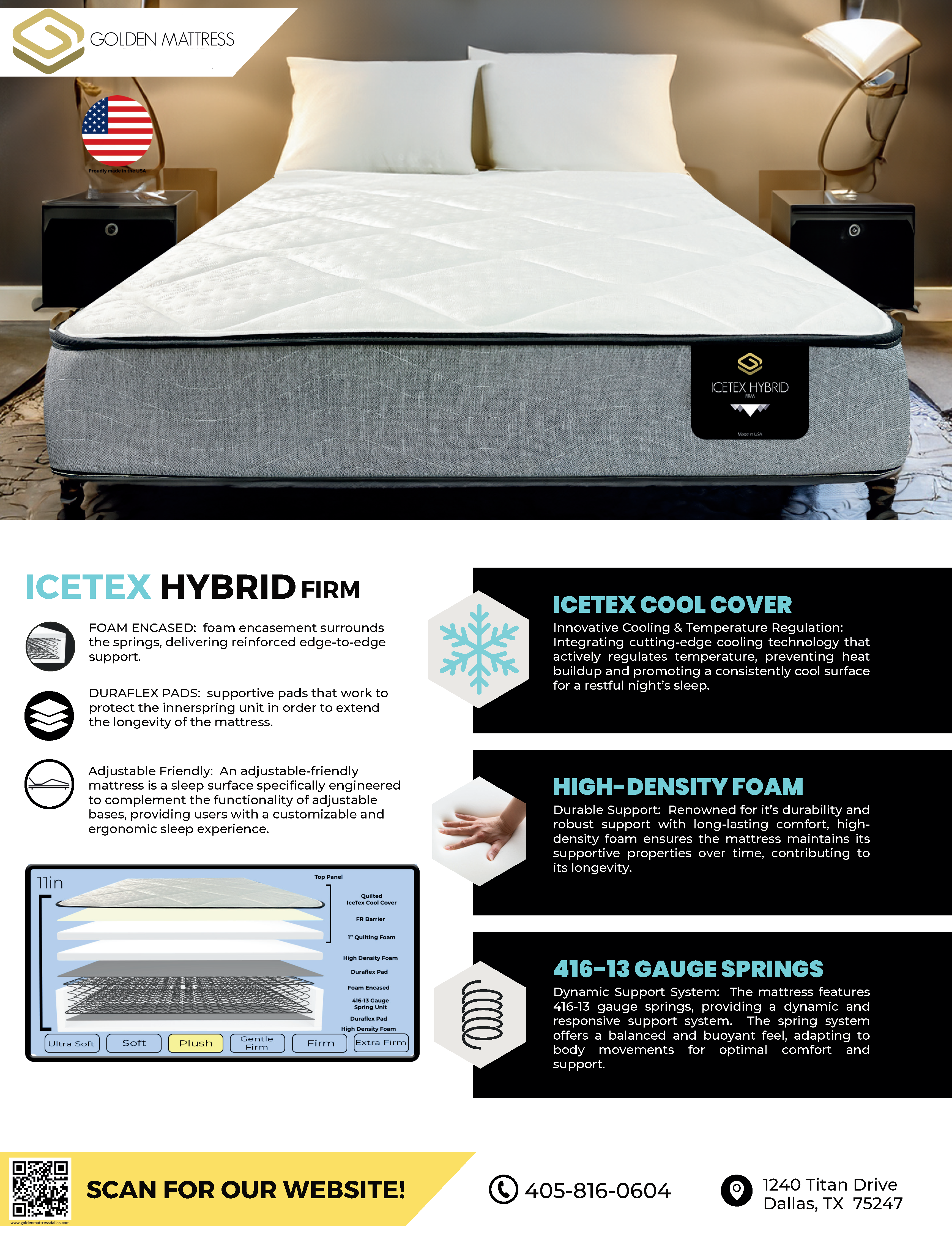 In summary, the IceTex Hybrid Firm Mattress is an ideal solution for those seeking a cooler, adjustable, and supportive sleep environment with a firm yet plush feel. It combines the latest in sleep technology with luxurious comfort, making it a perfect choice for a rejuvenating night's sleep.