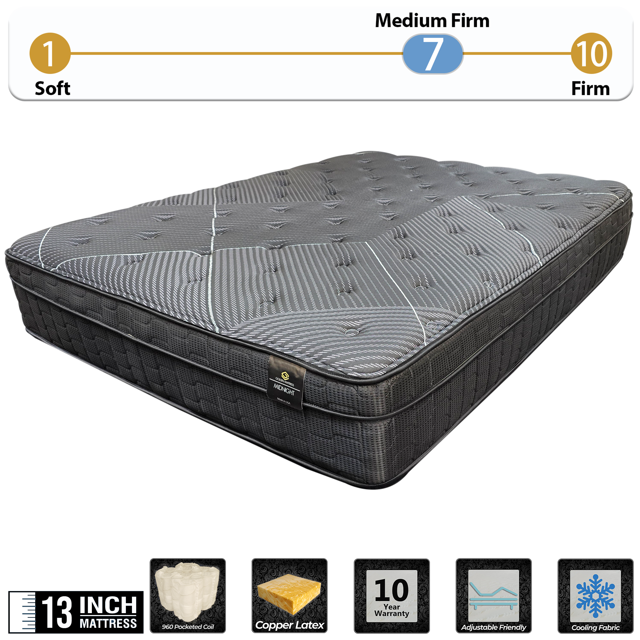 Introducing the Midnight Eurotop—a 14-inch mattress that combines luxurious comfort with advanced support and cooling technology. Designed for sleepers who crave a balanced mix of plushness and responsiveness, this mattress features a 2-inch quilted top and 2 inches of copper latex foam, known for its cooling and antimicrobial properties.