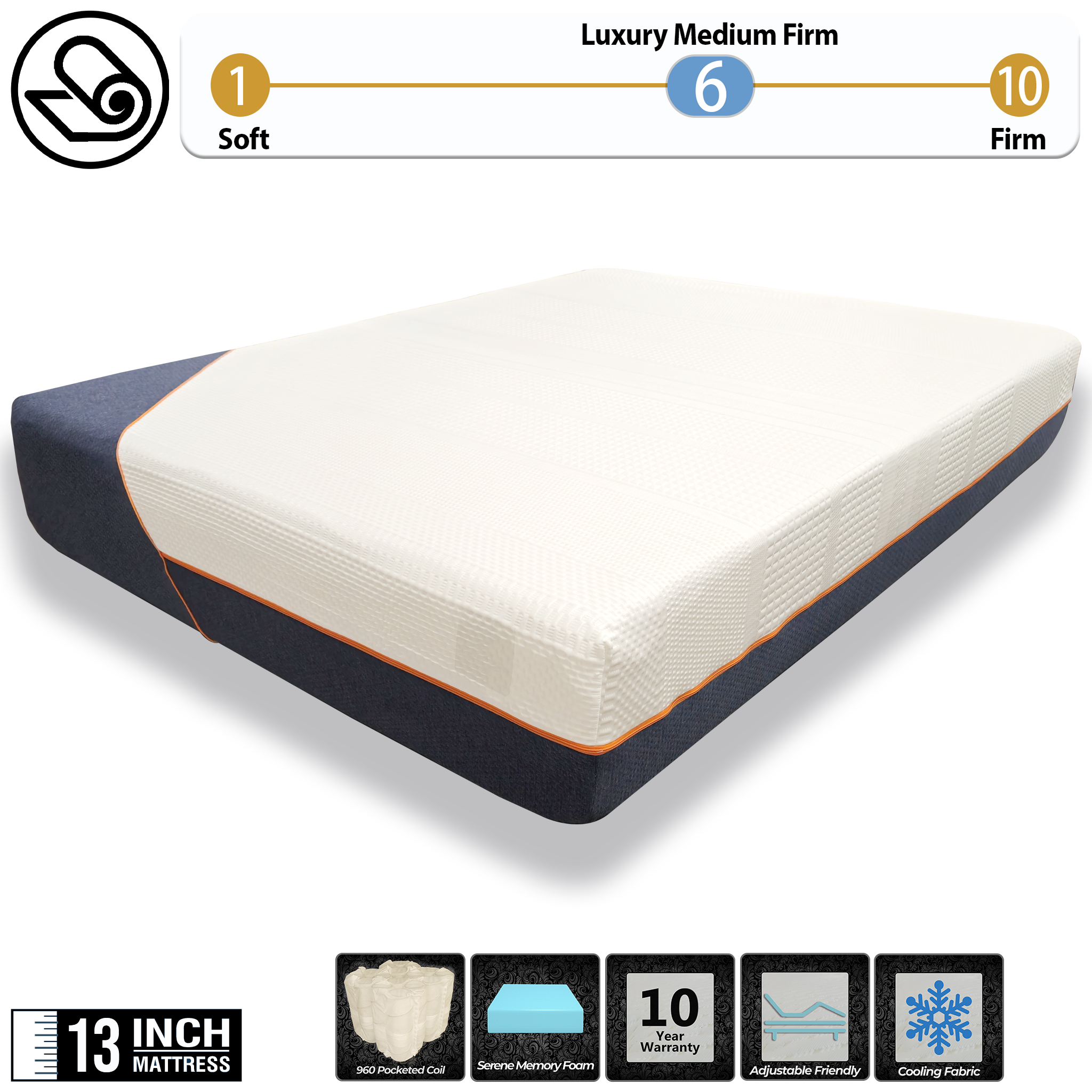Introducing the Nimbus iMod Firm 13-inch Hybrid Mattress—designed to deliver the ultimate sleep experience through innovative comfort, support, and cooling technology. This mattress features Serene Memory Foam and super soft foam layers, offering an ideal blend of firm support and plush comfort. The pocketed coil system, encased in high-density foam, provides precise support while reducing motion transfer, ensuring undisturbed sleep.