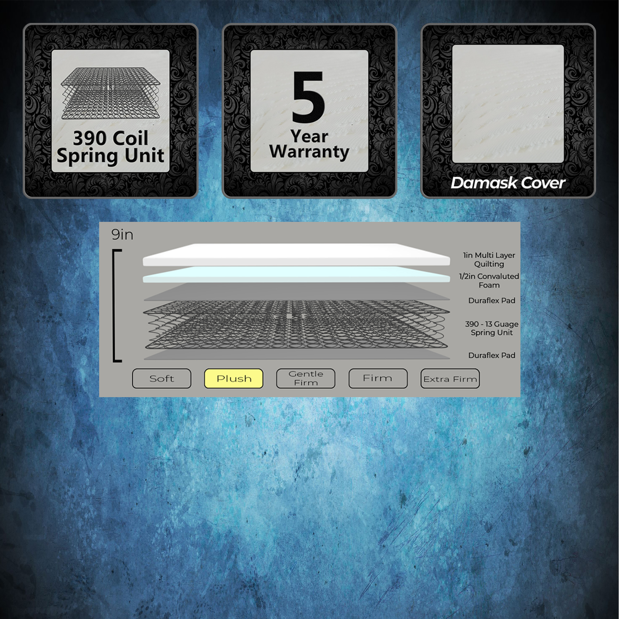 The flagship model of our Premier Collection, the Plush introduces a different look with a lovely and softer damask cover. The 390 Bonnell spring unit gives you that durable and familiar feel but the super soft quilting is what makes this collection shine. Super easy $329 Queen set door buster special!