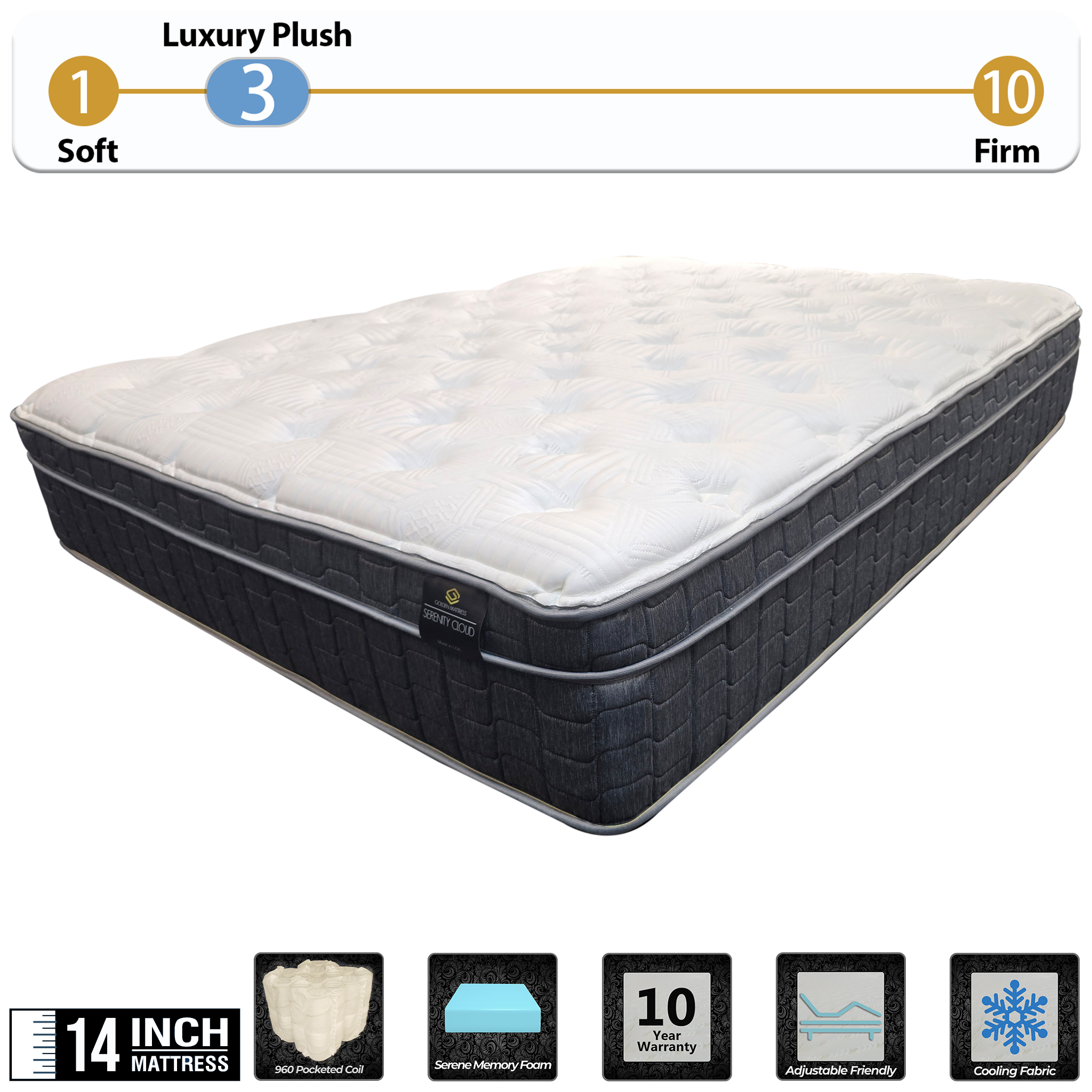 Introducing the Serenity Cloud mattress—where plush comfort meets solid support for an exceptional sleep experience. This 14-inch luxury mattress offers a cloud-like feel with its 2-inch quilted top and a combination of premium foams designed to cradle and support your body throughout the night.