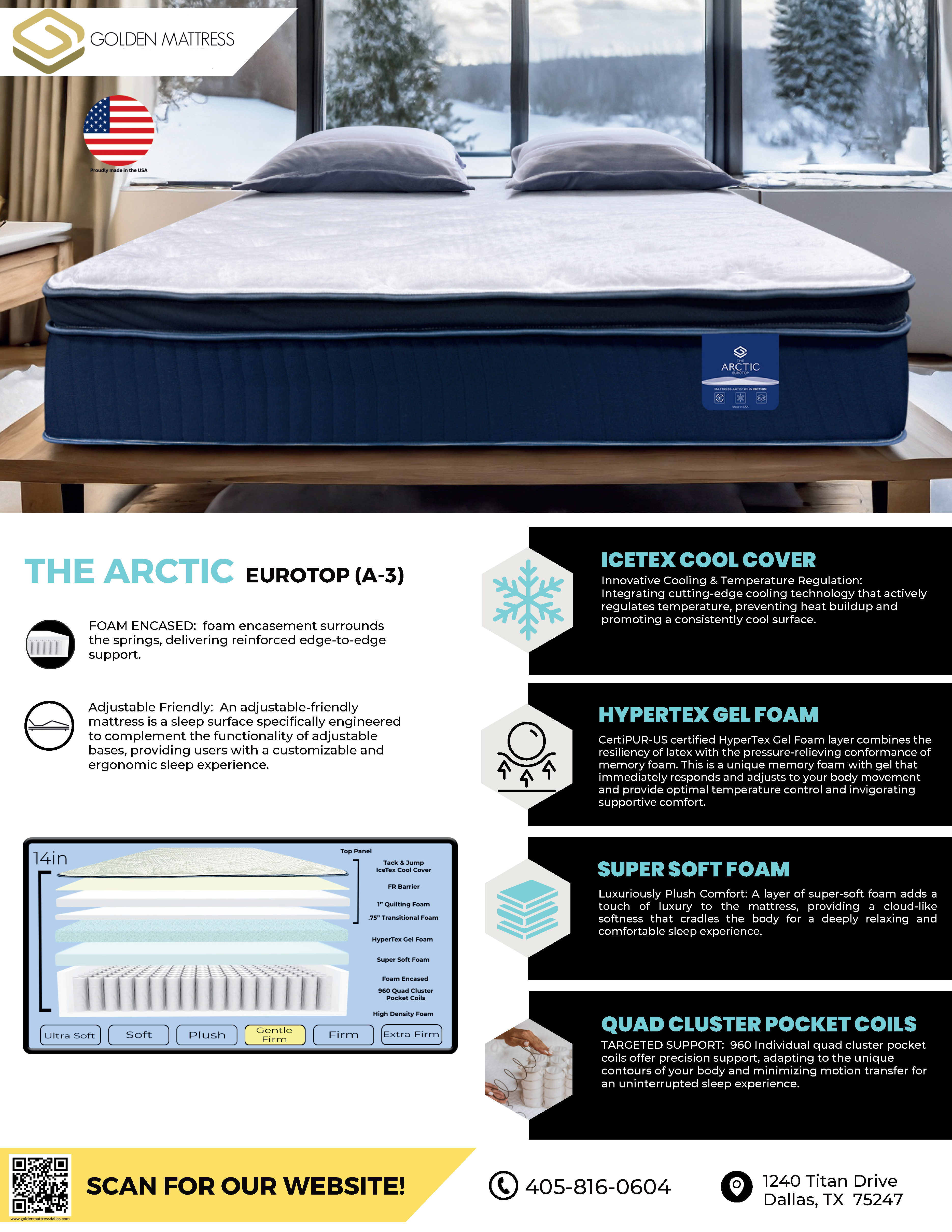 Introducing the Arctic Euro Top Mattress: a 14-inch thick haven of sleep comfort, designed to revolutionize your rest experience. This mattress stands out as a pinnacle of innovative sleep technology and plush luxurious comfort.